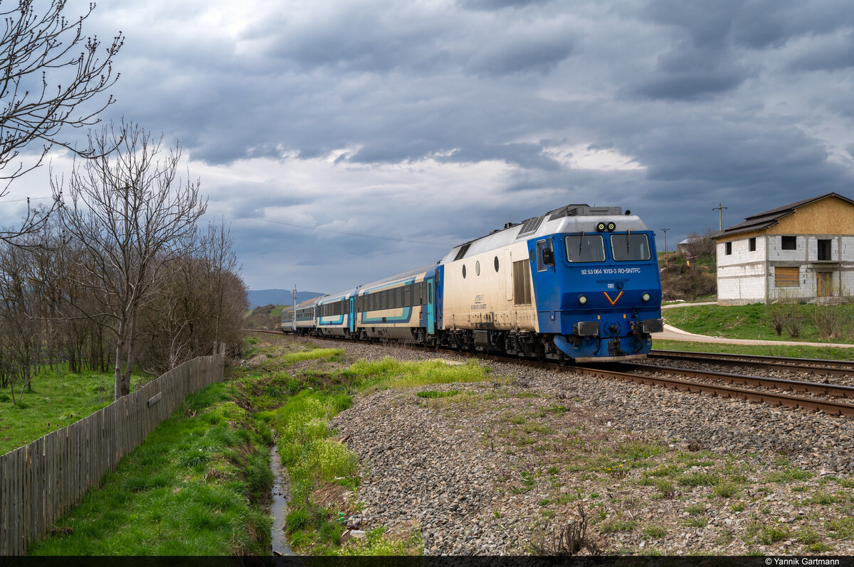 Am 14.04.2023 ist CFR Călători 64 1013 unterwegs mit dem IR 367 von Budapest-Keleti nach Brașov und konnte hier bei Huedin, Rumänien aufgenommen werden