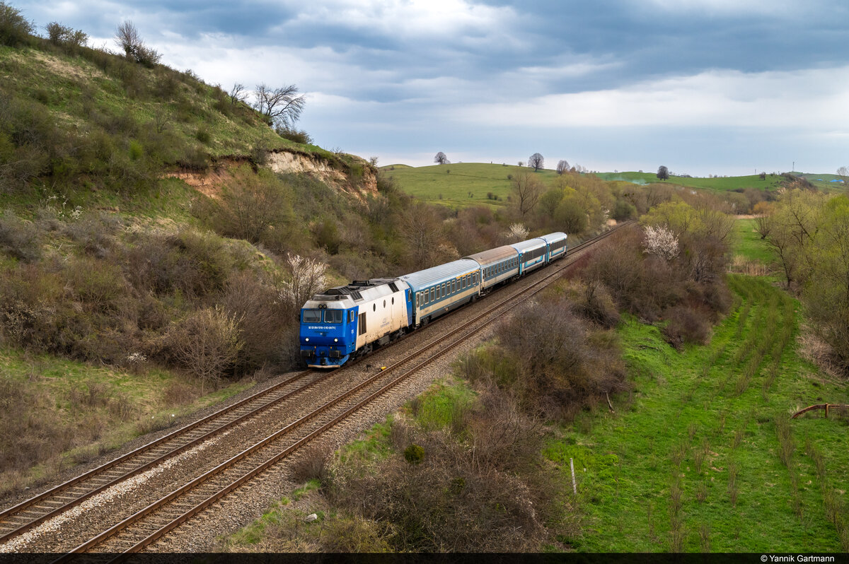 Am 14.04.2023 ist CFR Călători 64 1019 unterwegs mit dem IR 366 von Brașov nach Budapest-Keleti und konnte hier bei Huedin, Rumänien aufgenommen werden