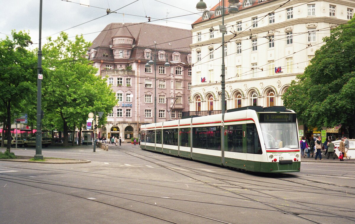 AVG Augsburg__Combino 821 [Siemens, 1999] am Königsplatz.__05-2000