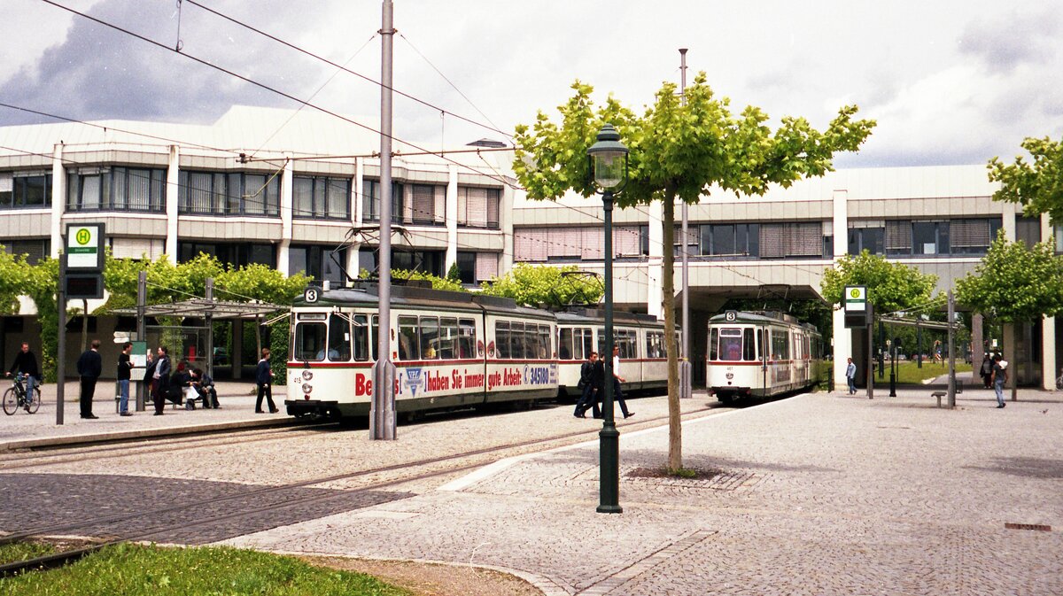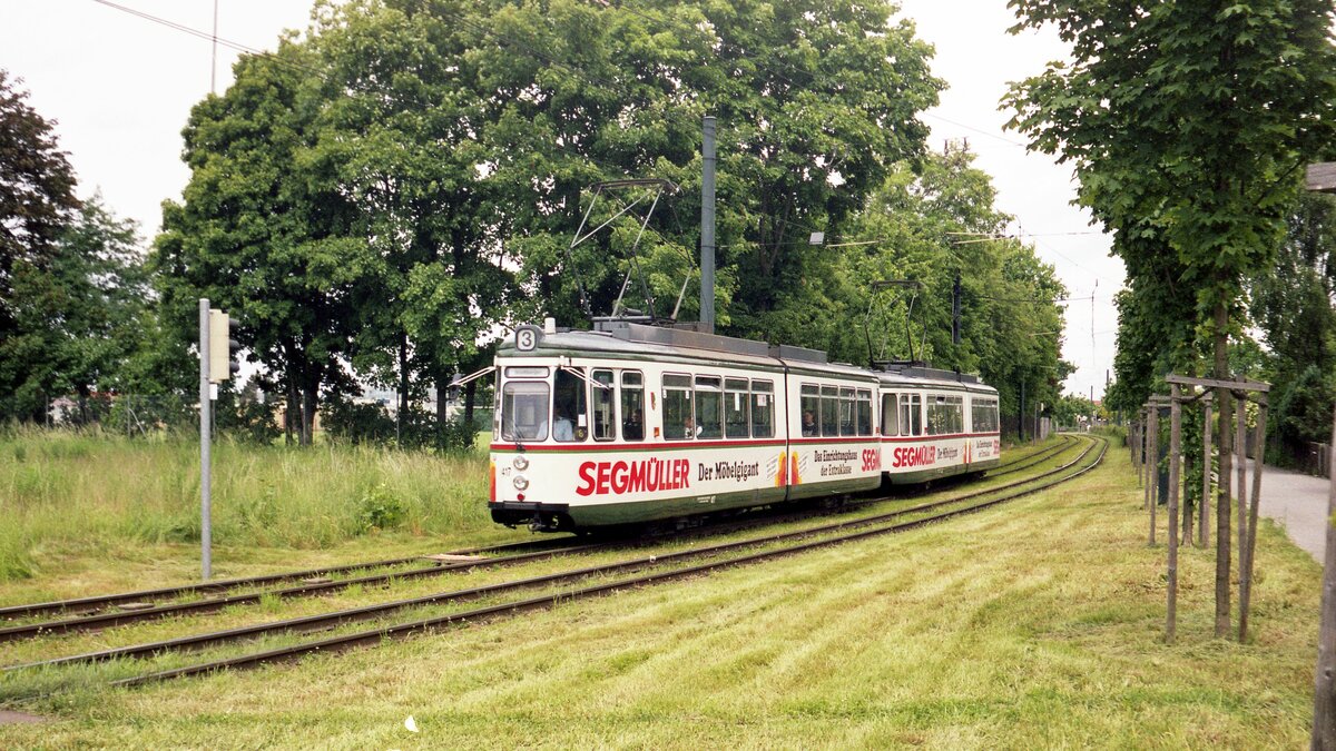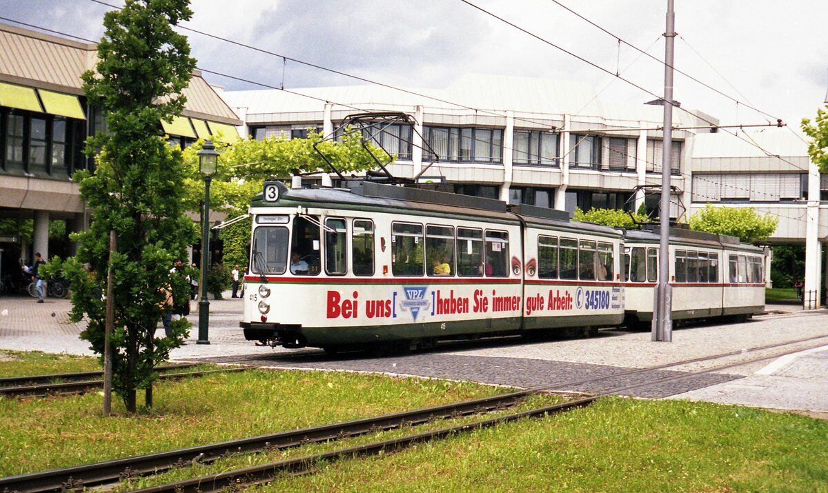 AVG Augsburg__GT4-Zug ex SSB auf Linie 3 an der Haltestelle Universität.__05-2000