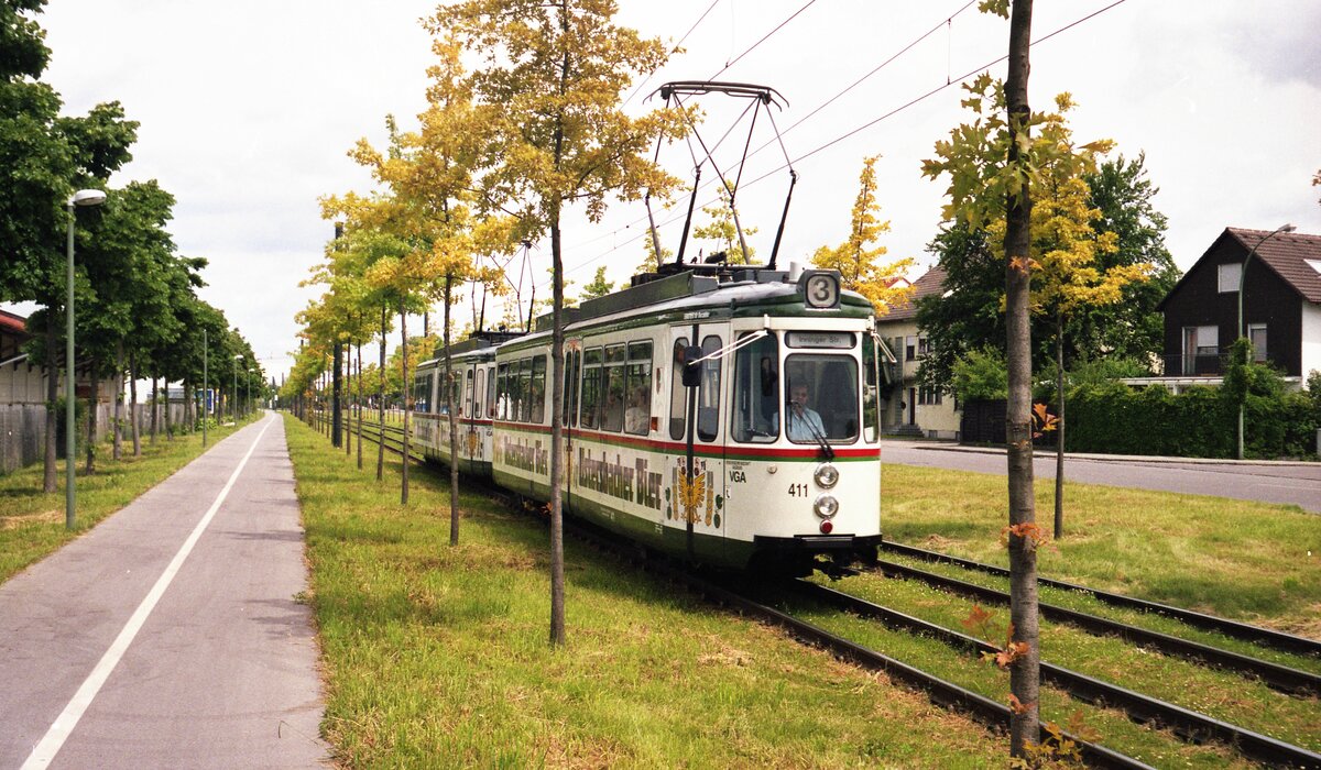 AVG Augsburg__GT 4 Nr. 411 [ME 1962, ex SSB 591] auf Linie 3 in Haunstetten Richtung Inninger Str.__05-2000