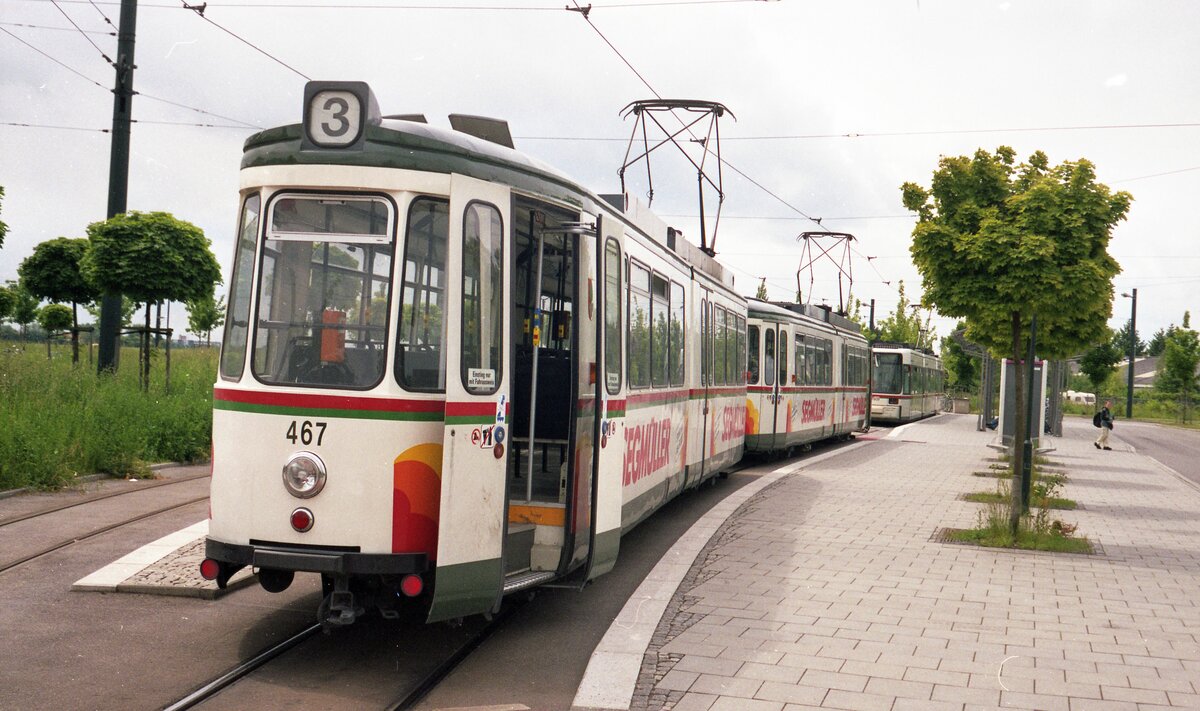 AVG Augsburg__GT 4 Nr. 467 [ME 1962, ex SSB 593] als Bei-Tw auf Linie 3 in der Endschleife 'Inninger Str.'.__05-2000