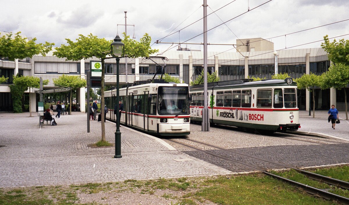 AVG Augsburg__Haltestelle Universität_Tw 607 [GT6M ADtranz 1996] und GT4 Nr.451 [ME 1960, ex SSB 580] als Bei-Tw, auf Linie 3 Haltestelle Universität.__05-2000