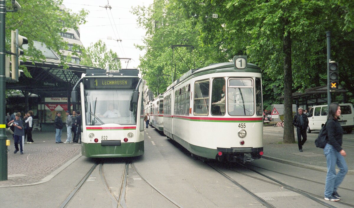 AVG Augsburg__Königsplatz mit Combino Nr. 822 [Siemens, 2000] und GT 4 Nr. 455 [ME 1960, ex SSB 581] als Bei-Tw auf Linie 1.__05-2000