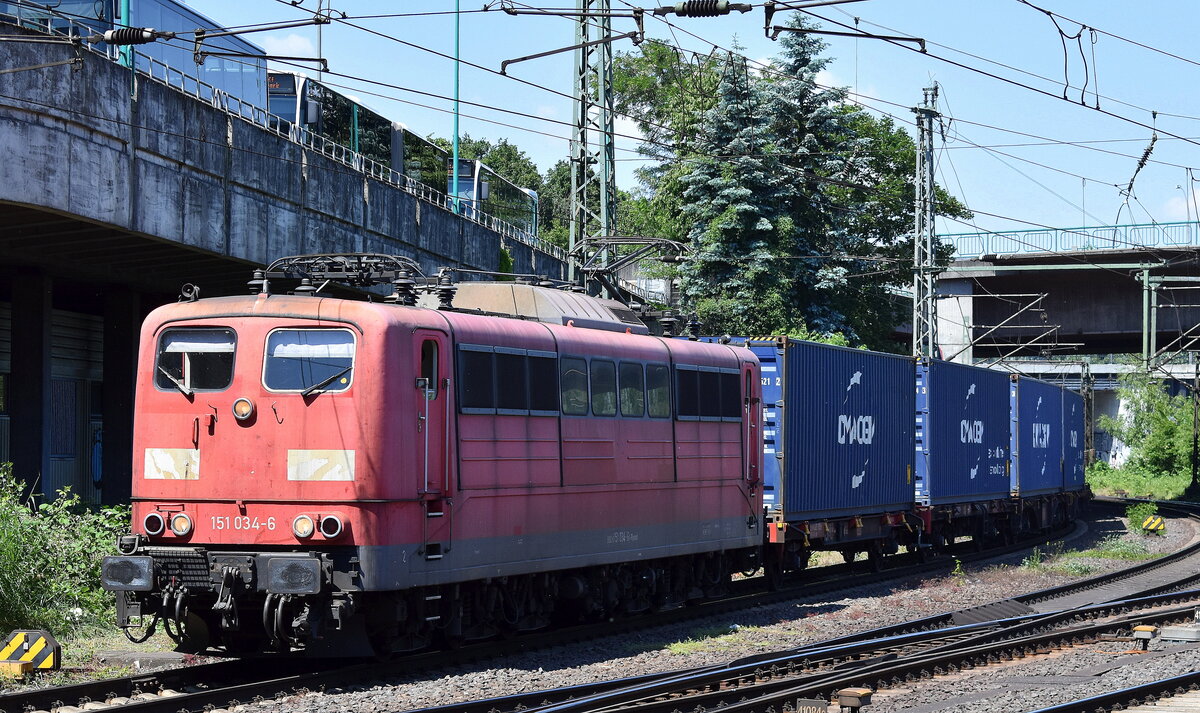 DB Cargo AG, Mainz mit der Railpool Lok  151 034-6  (NVR:  91 80 6151 034-6 D-Rpool ) und einem Containerzug am 13.06.23 Vorbeifahrt Bahnhof Hamburg Harburg.