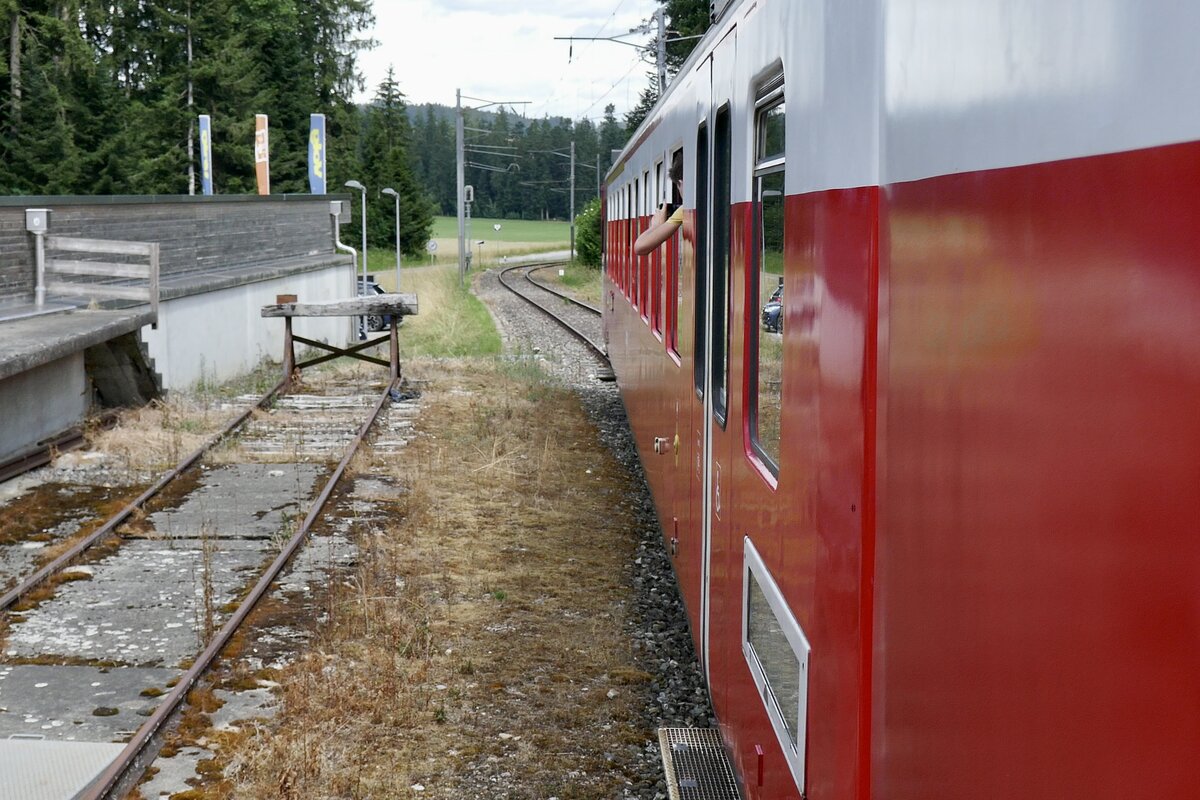 Vor ein paar Minuten ist der Dampfzug nach St. Pölten in Mariazell abgefahren. Wir rattern über Brücken und durch die wunderschöne Landschaft und geniessen die Fahrt im offenen Aussichtswagen trotz Regenwetter. Mariazell, 11.6.2023