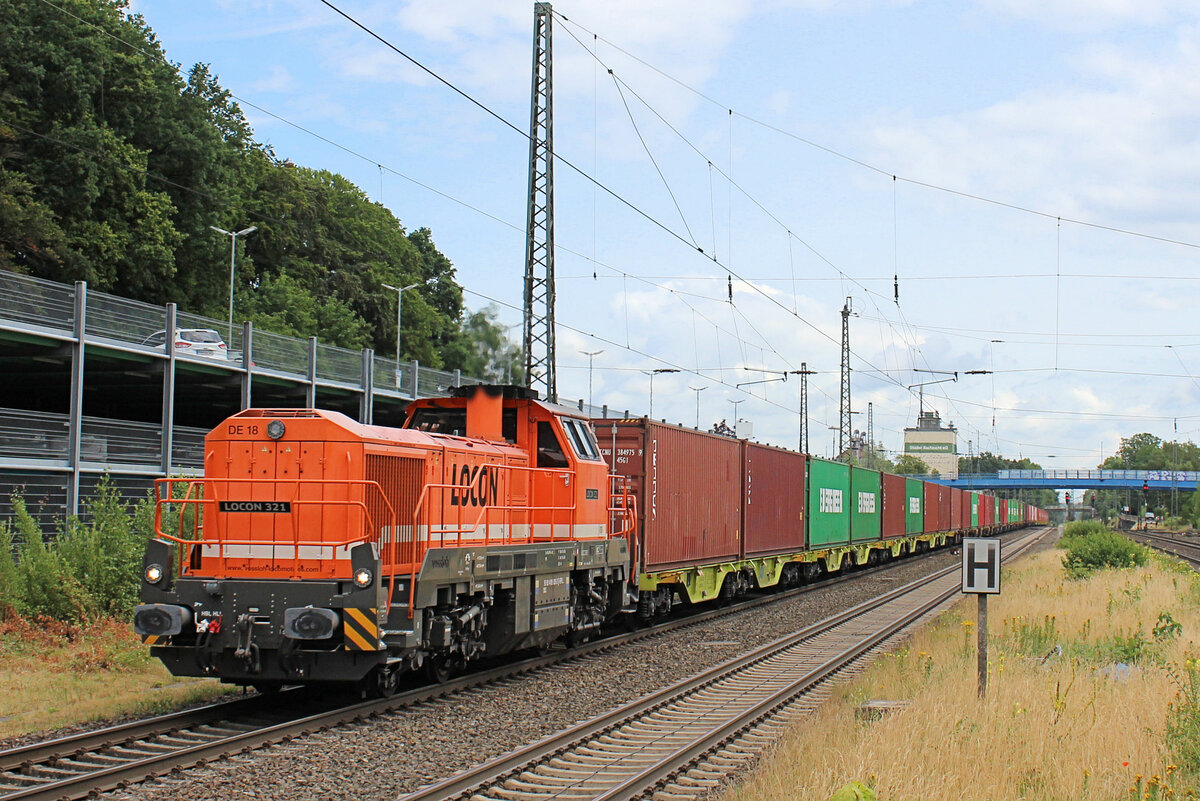 LOCON 321 kommt mit einen Containerzug aus den Hamburger Hafen. Tostedt, 30.06.2023.