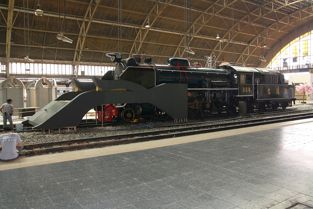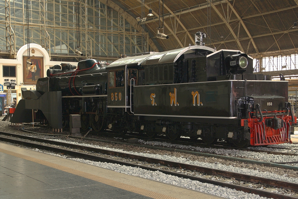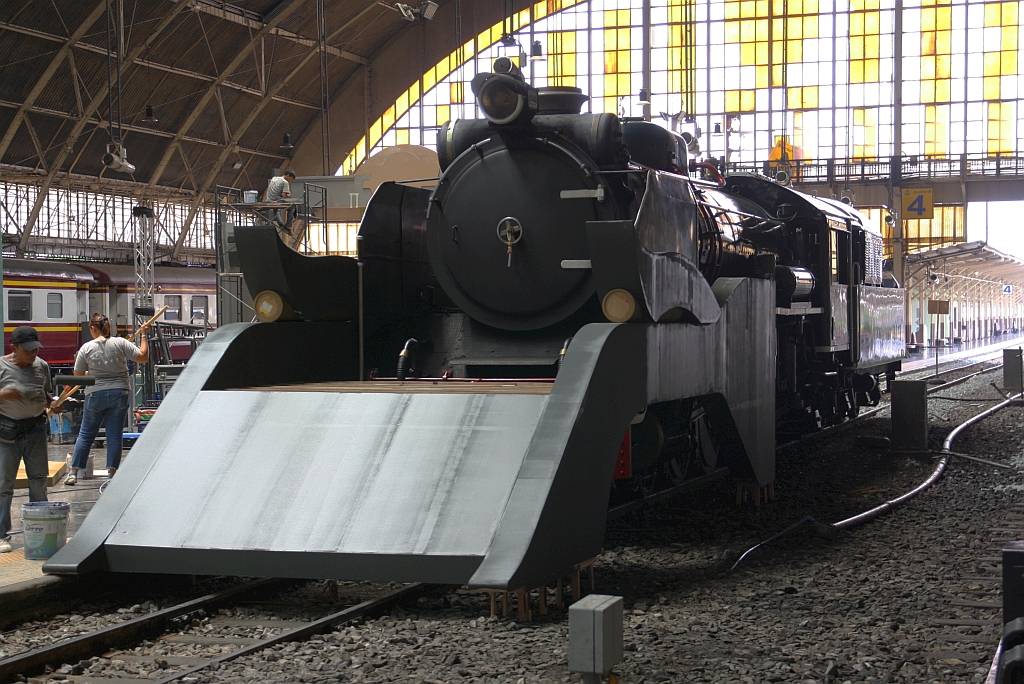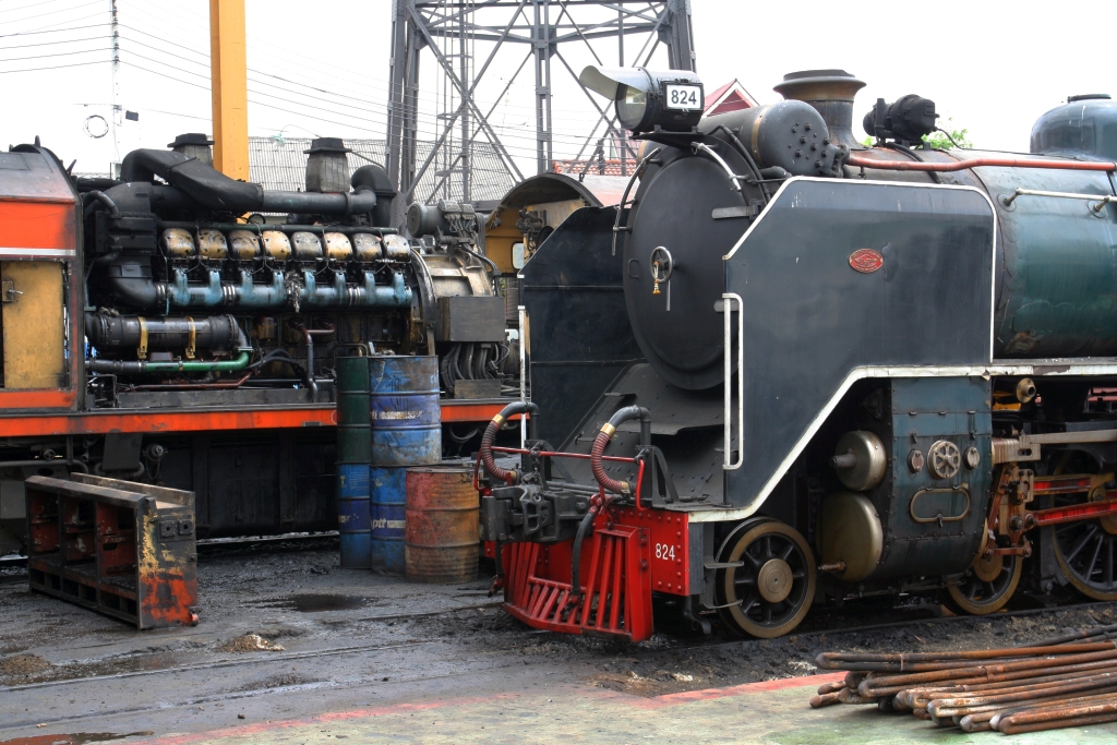 Während die AHK 4206 (Co'Co', de, Krupp, Bj.1980, Fab.Nr. K-5477) am 28.April 2023 im Depot Thon Buri eine größere Reparatur erhält wartet daneben die 824 (2'C1'h2, Nippon Sharyo (Japan), Bauj. 1949, Fab.Nr. 1525) auf ihren nächsten Einsatz.