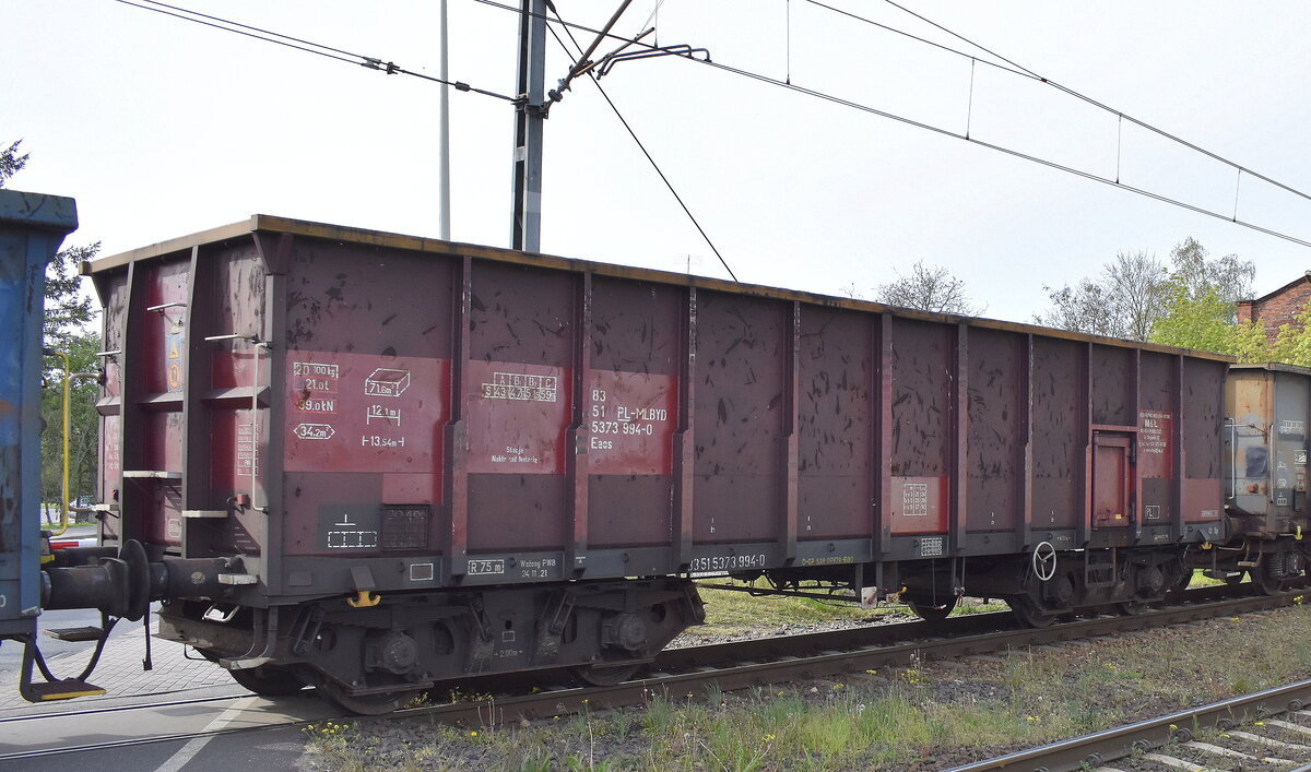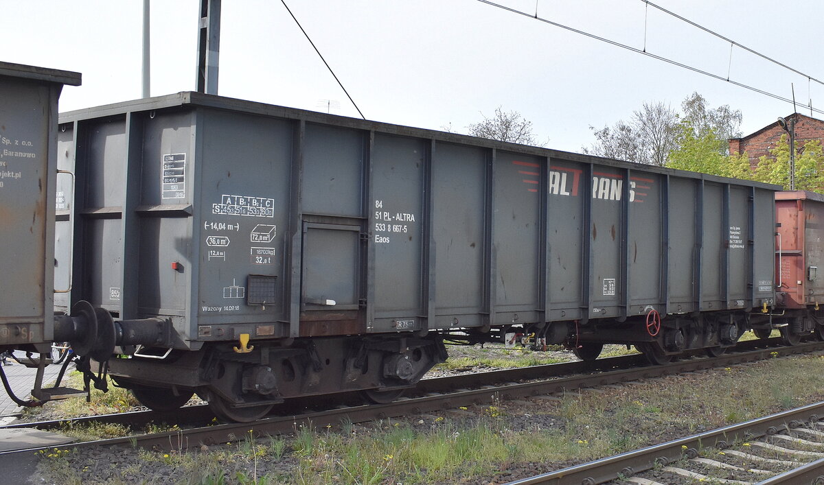 Polnischer Drehgestell-Hochbordwagen vom Einsteller Eurowagon sp. z.o.o. mit der Nr. 84 51 PL-EUWAG 5333 431-1 Eaos in einem Ganzzug am 04.05.23 Bahnhof Kostrzyn nad Odrą.