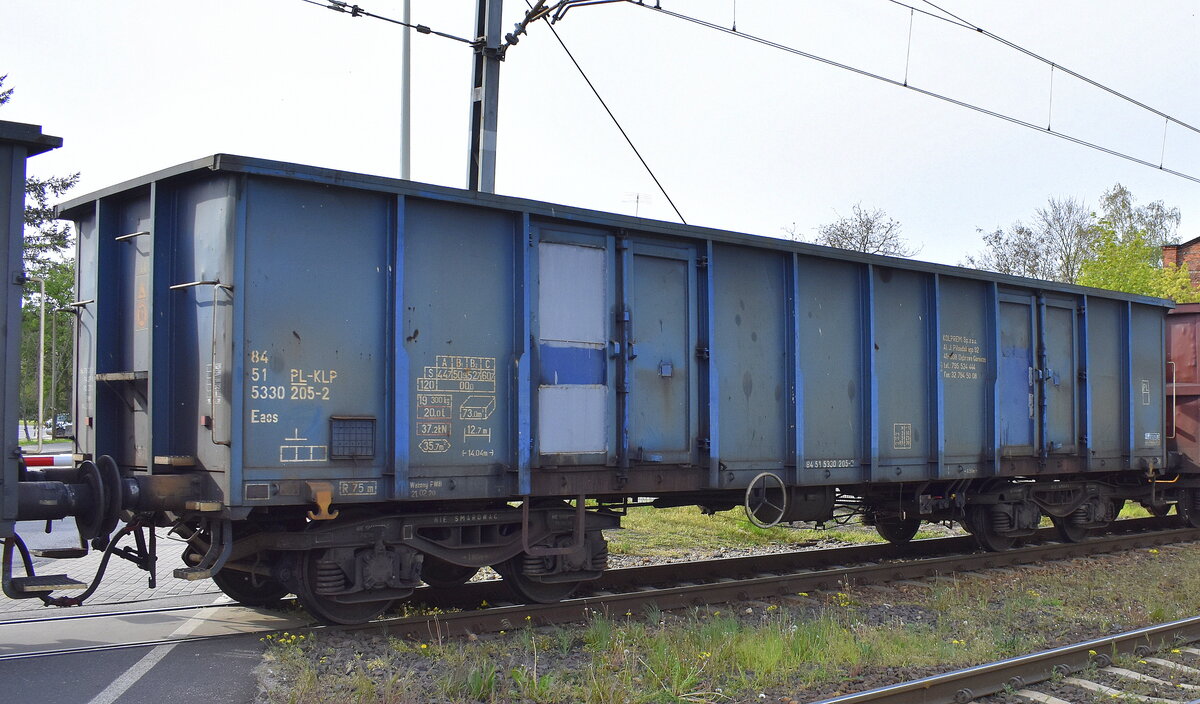 Polnischer Drehgestell-Hochbordwagen vom Einsteller KOLPREM Sp. z o.o. mit der Nr. 84 51 PL-KLP 5330 205-2 Eaos in einem Ganzzug am 04.05.23 Bahnhof Kostrzyn nad Odrą.
