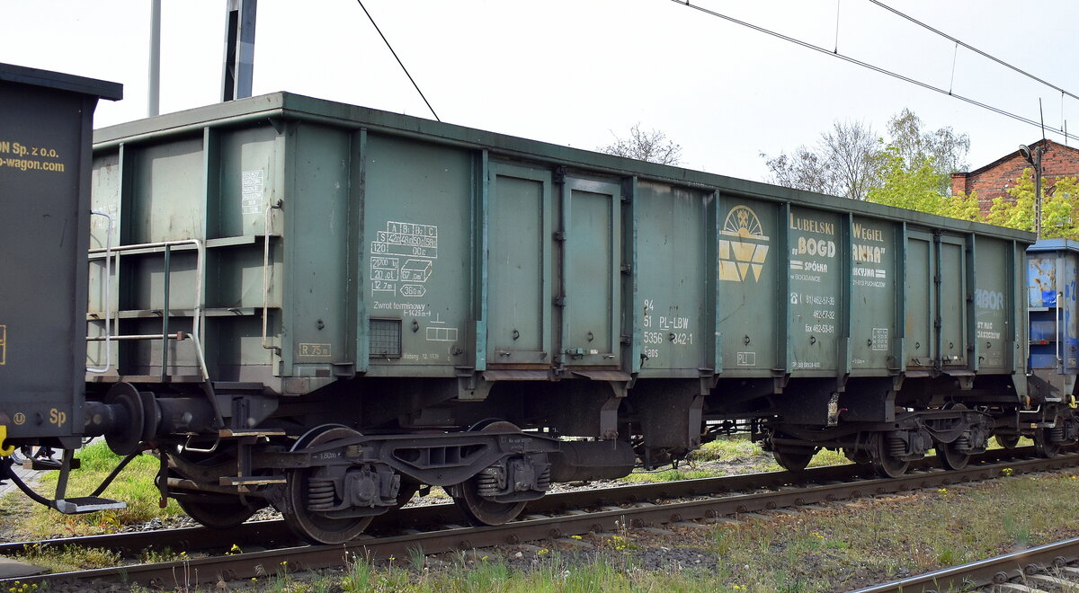 Polnischer Drehgestell-Hochbordwagen vom Einsteller Lubelski Wegiel ''Bogdanska'' S.A. W Bogdance mit der Nr. 84 51 PL-LBW 5356 842-1 Eaos  in einem Ganzzug am 04.05.23 Bahnhof Kostrzyn nad Odrą.