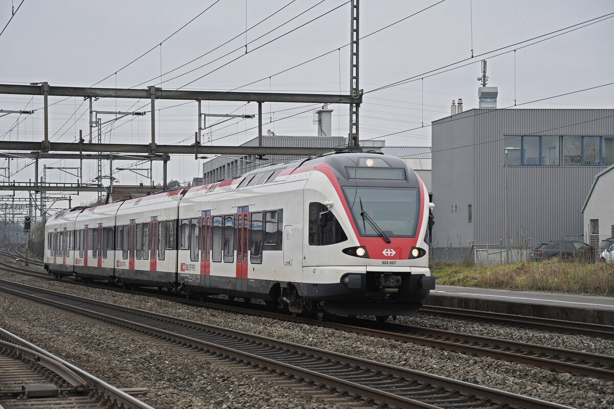 RABe 523 057, auf der S26, durchfährt am 26.01.2023 den Bahnhof Rupperswil.
