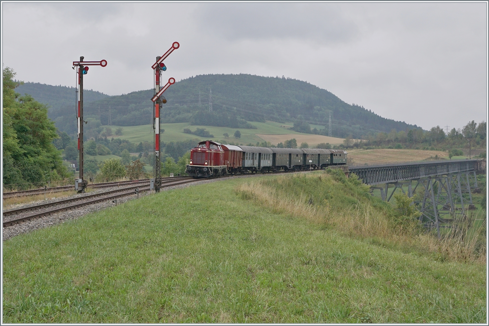Die Diesellok 211 041-9 (92 80 1211 041-9 D-NeSA) verlässt mit ihrem  Morgenzug  die Talübergang Epfenhofen Brücke und erreicht den Bahnhof Epfenhofen. Die Talübergang Epfenhofen Brücke ist mit 264 Meter Länge die längste Brücke der Sauschwänzlebahn und soweit ich gesehen habe auch die imposanteste Brücke der Strecke.