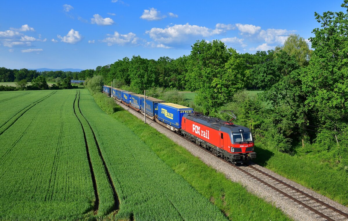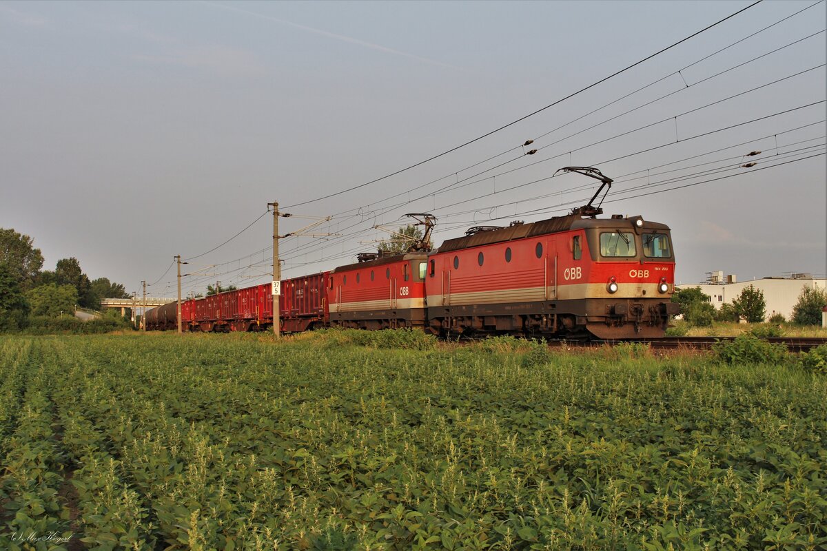 Am noch angenehm kühlen Morgen des 11.7.2023 kämpft sich die Sonne über dem Industrieviertel in Niederösterreich gerade durch den Hochnebel während die 1144 203 und die 1144 044 mit dem DG54072 von Graz Vbf nach Wien Zvb in Ebenfurth auf die Weiterfahrt warten.