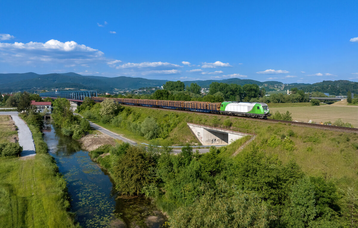 223 102 mit einem Holzzug am 31.05.2023 bei Deggendorf.