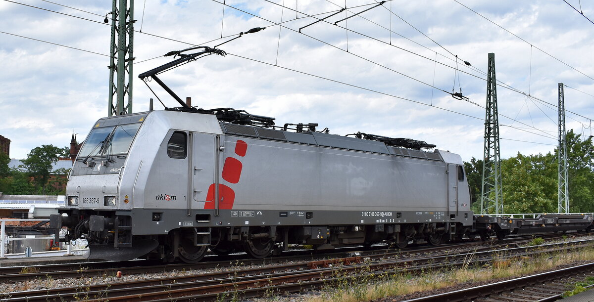 Akiem Lok "E 186 236" [NVR-Nummer: 91 80 6186 236-6 D-AKIEM], aktueller Mieter? mit einem PKW-Transportzug am 19.07.23 Höhe Bahnhof Magdeburg-Neustadt.