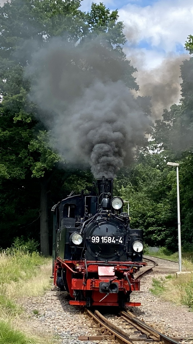 Die Br 99 2323-6 der Mecklenburgischen Bäderbahn Molli zieht ihren Zug durch Kühlungsborn Richtung Bad Doberan. 22.7.2023