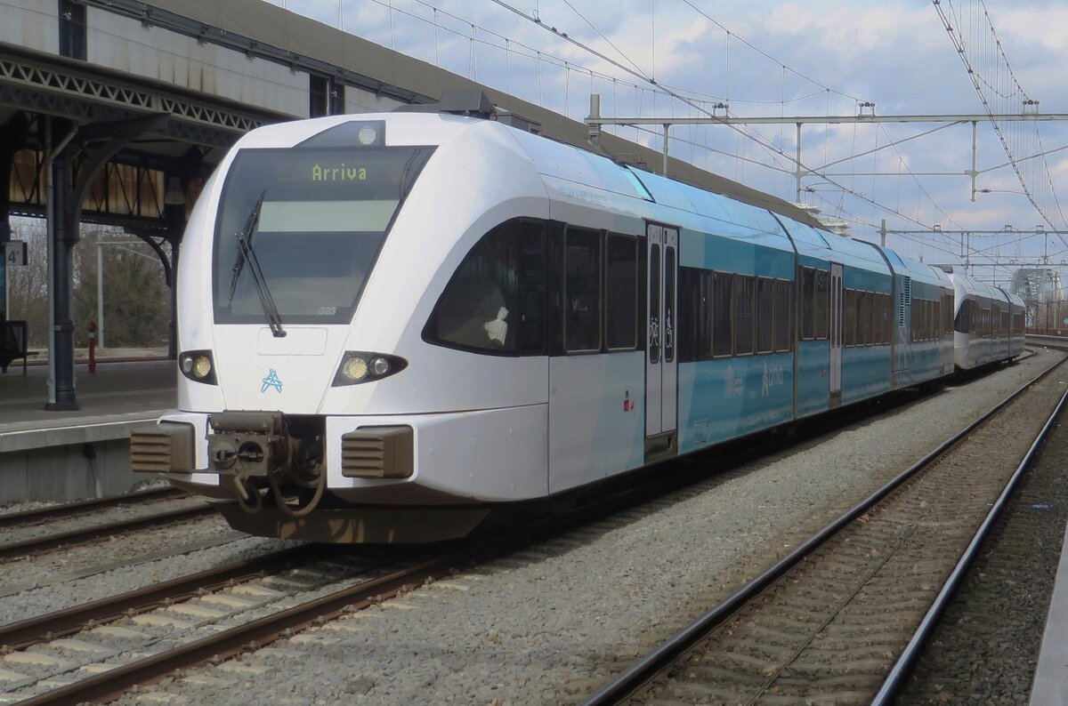 Arriva Noord 323 steht am 12 März 2022 in Nijmegen. Die GTW 2/8 sind in die Niederlande als Reihe 5307 eingereiht; die GTW 2/6 als Reihe 5207.