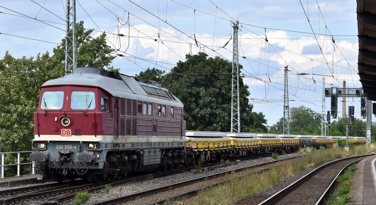 DB Bahnbau Gruppe GmbH, Berlin mit ihrer "232 550-4" (NVR: "92 80 1232 550-4 D-DB") und einem Güterzug Beton-Gleisschwellen am 19.07.23 Höhe Bahnhof Magdeburg-Neustadt.