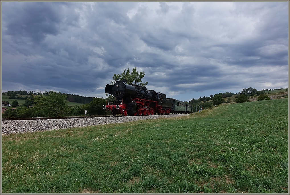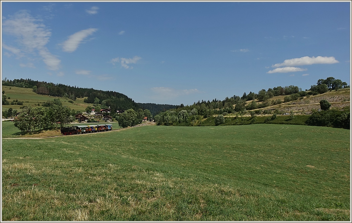 T 478 1146 (749 146) fuhr am 24.06.23 einen Sonderzug von Slaný nach Bochov. Hier ist der Zug bei Chyše zu sehen.
