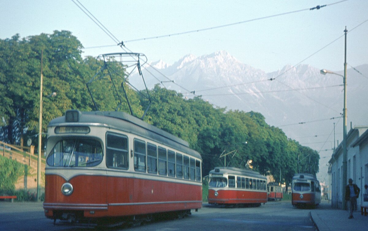 Straßenbahn Innsbruck___Mehrere "kurzer Lohner" im Betriebsgelände Bergisel.__10-08-1972