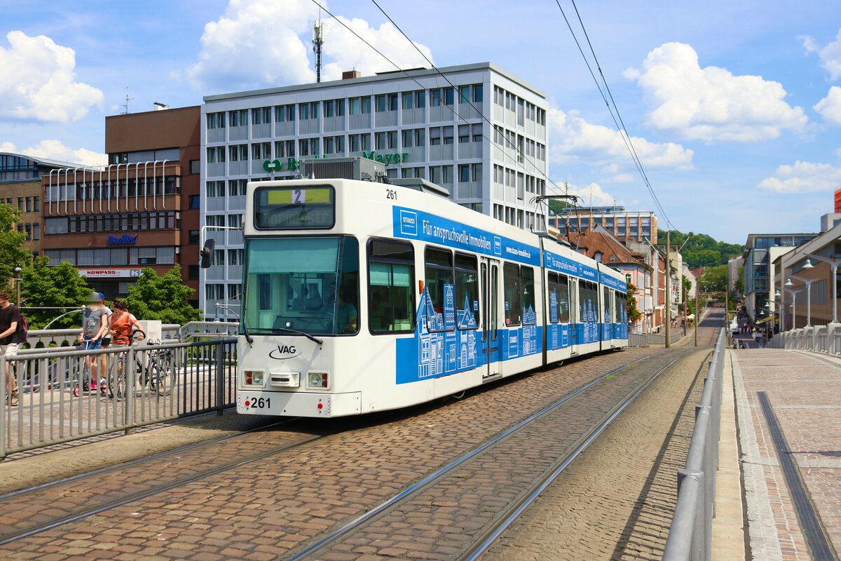 Linie 2 der Kölner Straßenbahn nach Ostheim mit einem Stadtbahnwagen Typ B.