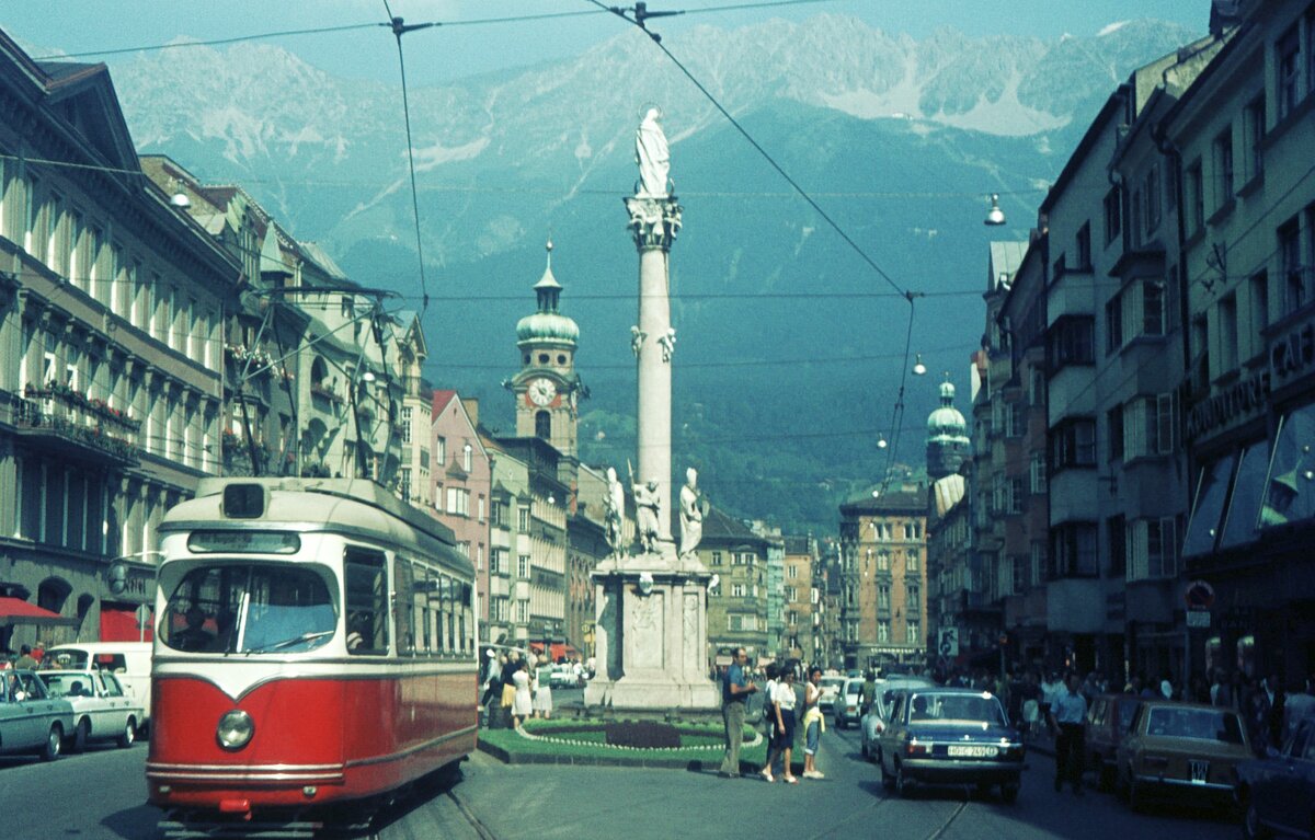 Straßenbahn Innsbruck___Ein GT6 [Lohner/ELIN; DUEWAG-Lizenz] auf Linie 1 passiert die Anna-Säule in der Maria-Theresien-Straße.__10-08-1972