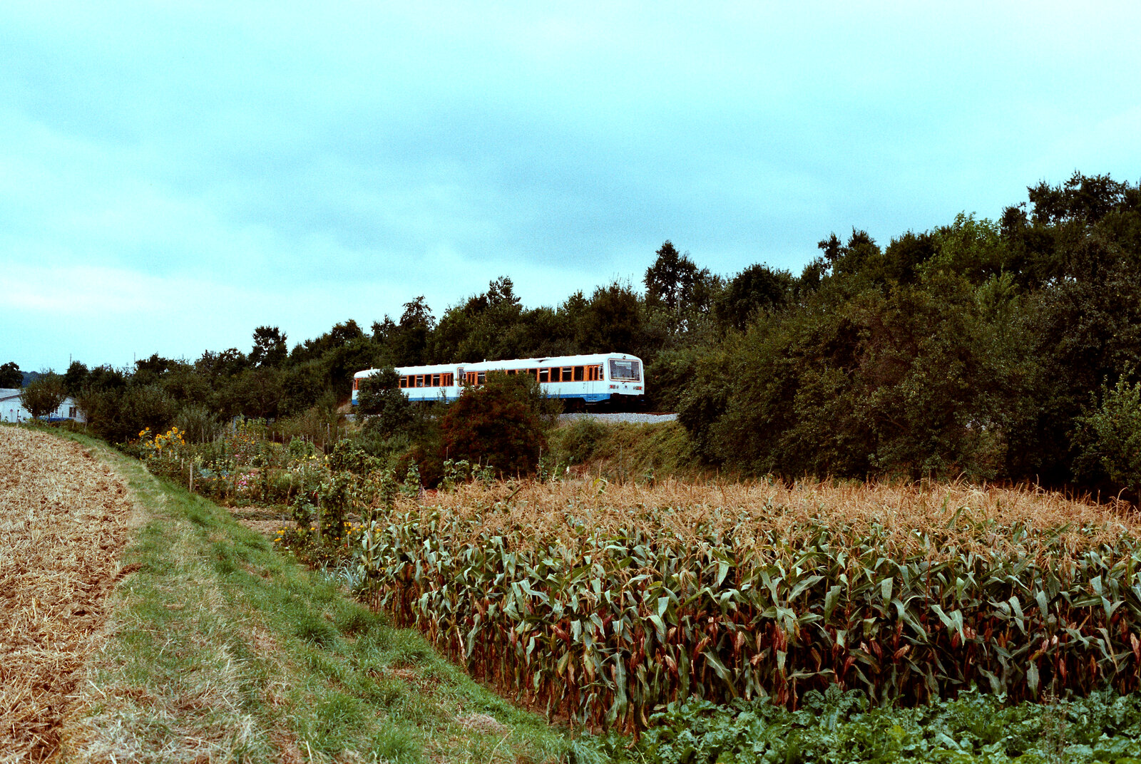 Zug 8715 von Bocholt nach Duisburg Hbf, nördlich vom Bahnhof Dingden unterwegs am 12.05.1984. Der BDnf735 führt und DB 216 034-9 schiebt. Scanbild 4475, Kodak Vericolor160.