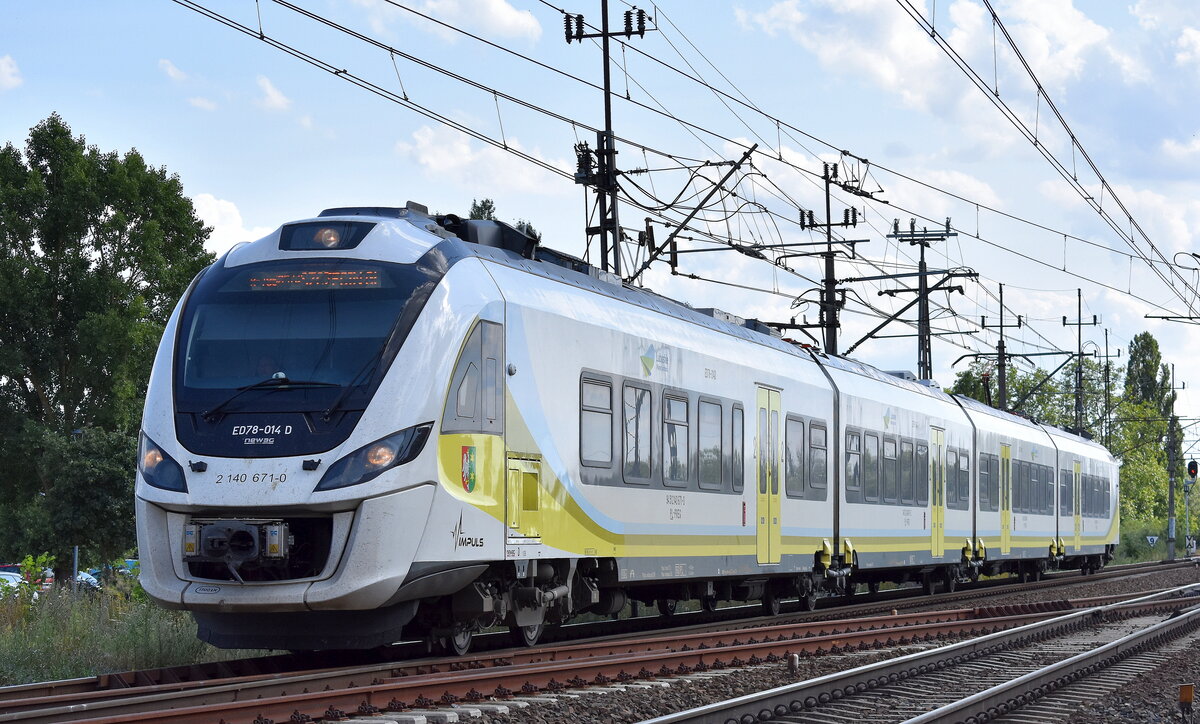 PKP Przewozy Regionalne Sp.z o.o. mit einem Regionalzug vom Typ IMPULS "ED78-014 D" (NVR: "94 51 2140 671-0 PL-PREG"....) am 14.07.23 kurz vor der Einfahrt Bahnhof Kostrzyn nad Odrą.