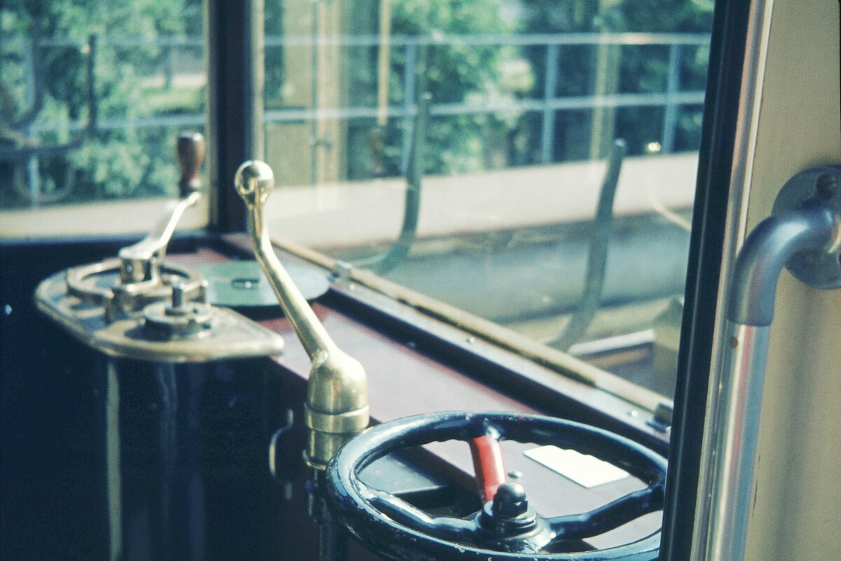 Pöstlingbergbahn Linz__Führerstand eines Tw, im Vordergrund das Handrad zur Bedienung der auf die Fahrschienen wirkende Zangenbremse.__28-07-1975