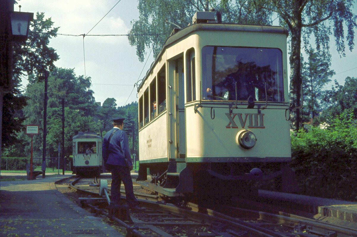 Pöstlingbergbahn Linz__Tw XVIII [1958] und XIV [1954] begegnen sich in der Ausweiche 'Schableder'.Der Schaffner stellt die (Schlepp-)Weiche. Heute schaut es dort etwas anders aus ...__28-07-1975