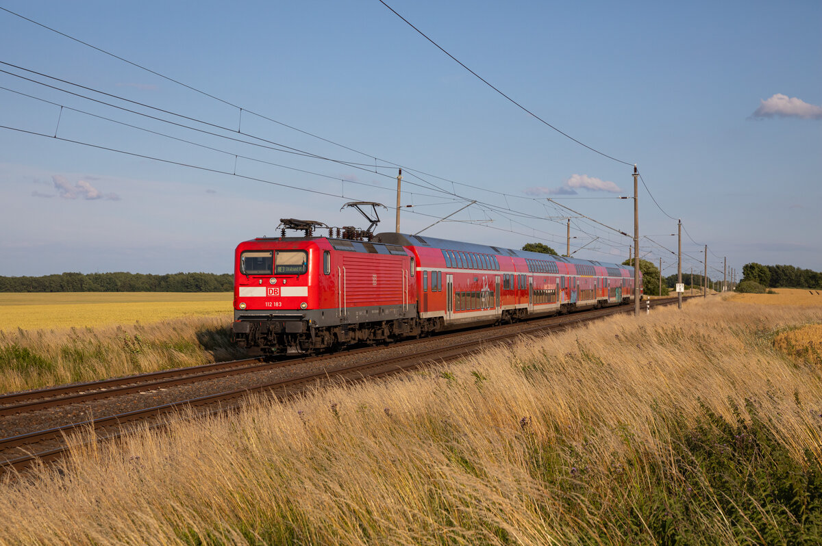 101 019 "Fahrtziel Natur" zieht Nachtzug/IC 408 von Berlin nach Leipzig, hier kurz vor Trebbin im letzten Abendlicht. Im Hintergrund die Brücke der B101. Trebbin, der 07.07.2023