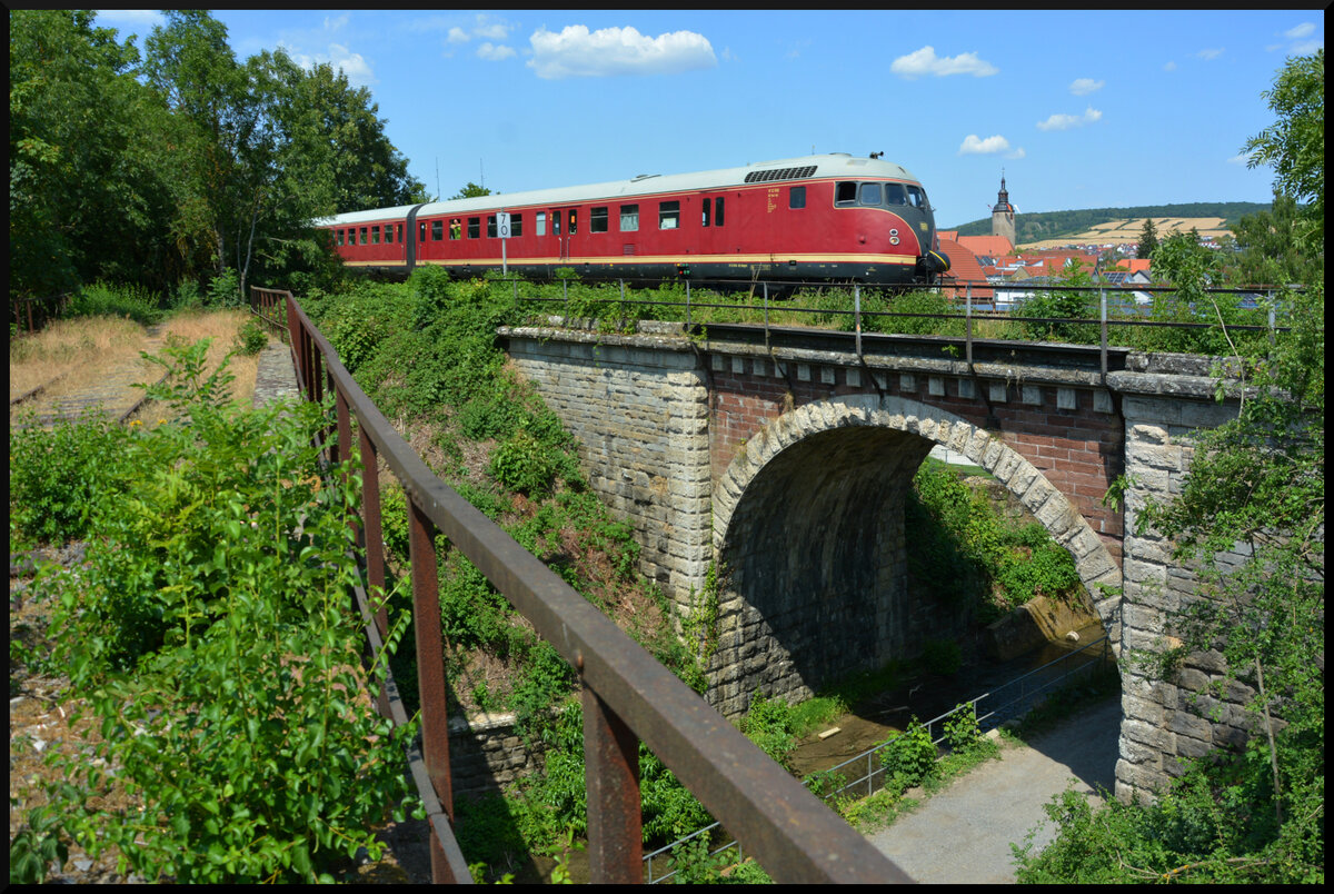 Der "Eierkopf" - "Stuttgarter Rössle" (VT 12 506/507) am 09.07.2023 vor der Kulisse Tauberbischofsheims. Das Geländer im Vordergrund gehört zur Brehmbach-Brücke der längst stillgelegten Bahnstrecke nach Königheim.