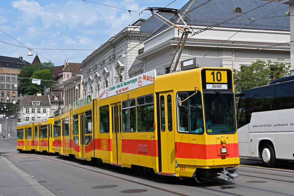 Doppeltraktion, mit dem Be 4/8 243 und dem Be 4/6 229, auf der Linie 10, fährt am 10.07.2023 den Steinenberg hoch zur Haltestelle Bankverein.