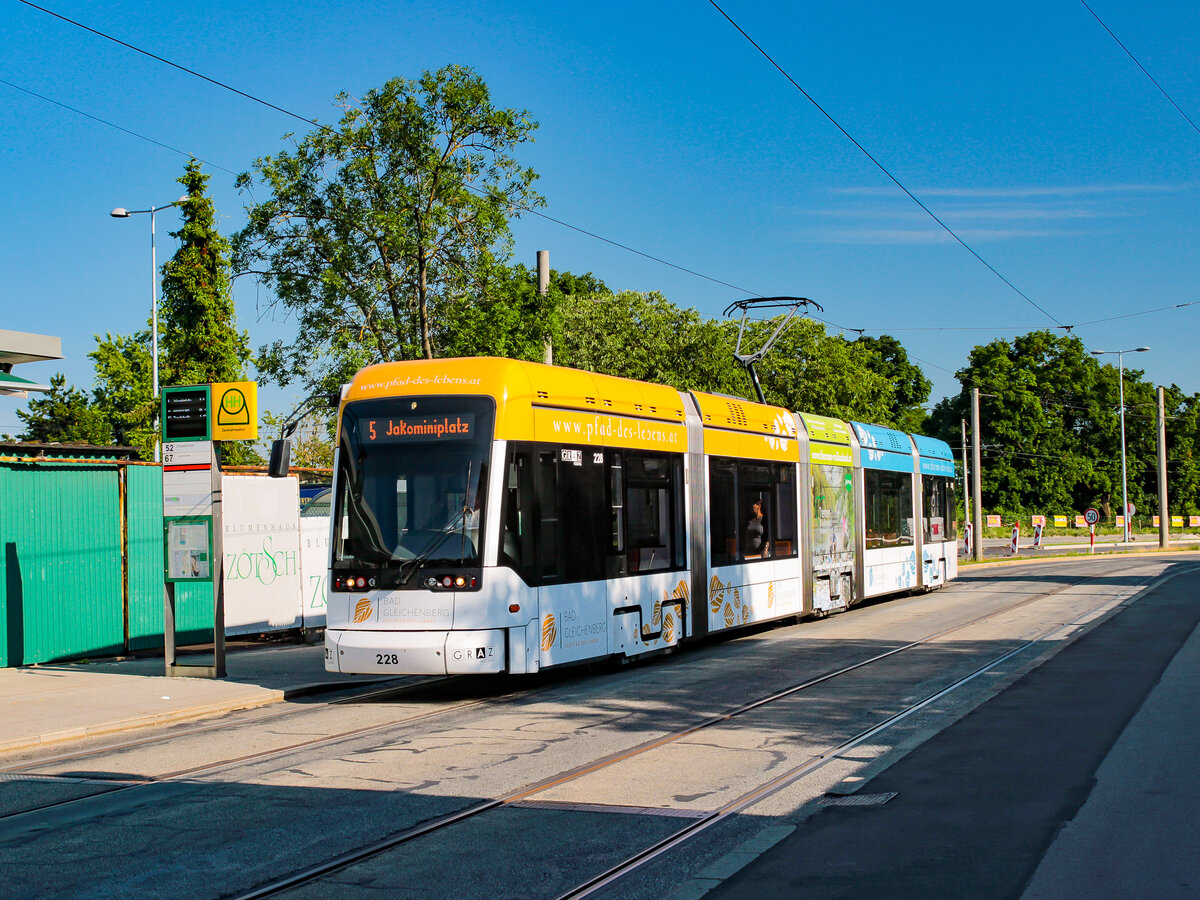 Graz. Variobahn 228 der Graz Linien steht hier am 08.07.2023 in der Haltestelle Znetralfriedhof Wende.