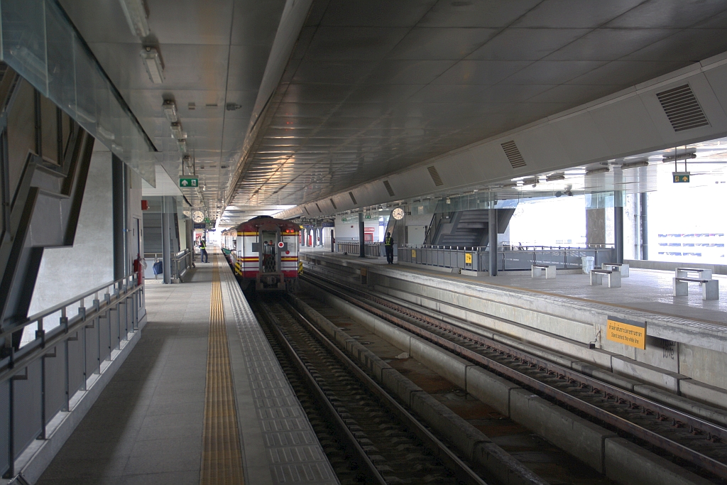 Seit der Inbetriebnahme der Krungthep Aphiwat Station der SRT (vorher Bang Sue Grand Station genannt) am 19.Jänner 2023 werden zwischen Krungthep Aphiwat Station bzw. Nikhom Rotfai Km. 11 Station und Don Muang Station im viergleisigem Abschnitt die beiden inneren Gleise von den Zügen der Northern und Northeastern Line ohne Halt befahren. - Da die Stationen der SRTET Red Lines mit Bahnsteigsperren versehen sind, jene der SRT Northern und Northeastern Lines jedoch frei zugänglich sind wurden die Don Muang und Rangsit Station in zwei Ebenen errichtet. - Das Bild vom 28.April 2023 zeigt die SRT-Don Muang Station, eine Etage höher befindet sich die SRTET Don Muang Station.