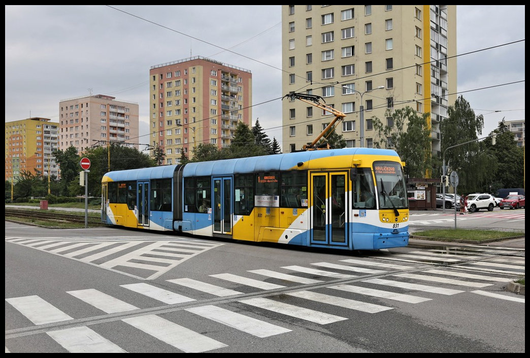 Trambahn Zug 831 ist hier auf der Linie 1 am 27.6.2023 um 11.18 Uhr in der Juzna Trieda Straße in Kosice in Richtung Altstadt unterwegs.
