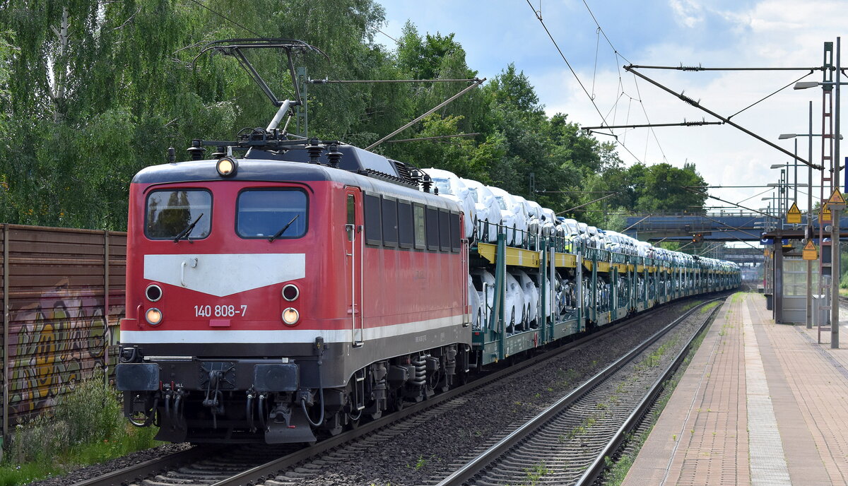 TRIANGULA Logistik GmbH, Calvörde mit ihrer "140 808-7" (NVR: "91 80 6140 808-7 D-TRG") und einem PKW-Transportzug am 06.07.23 Höhe Bahnhof Dedensen-Gümmer.