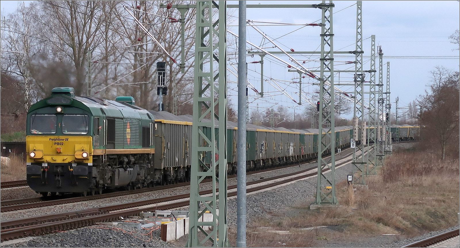 Auf dem Leipziger Güterring - ... passiert ein Güterzug mit Class 66 PB02 den Bahnhof Thekla. Zusammen mit Frank Paukstat hatten wir diesen Bahnhof als Fotostandort ausgewählt, allerdings war nur geringer Verkehr. Vielleicht hing es mit dem derzeitigen Ausbau der Strecke Leipzig - Dresden zusammen, was möglicherweise dazu führte, dass ein Großteil des Güterverkehres großräumig umgeleitet wurde. 21.03.2023 (M)