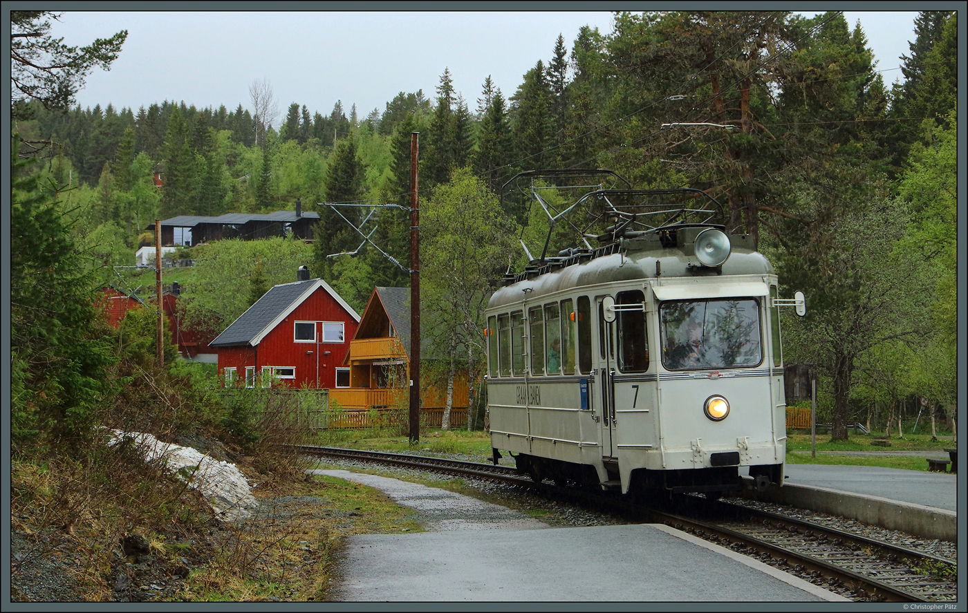 Der Tw 7 wurde 1942 an die Trondheimer Straßenbahn geliefert und wird heute für Sonderfahrten eingesetzt. Am 25.05.2023 rollt er durch die Haltestelle Herlofsonløypa Richtung Stadtzentrum.