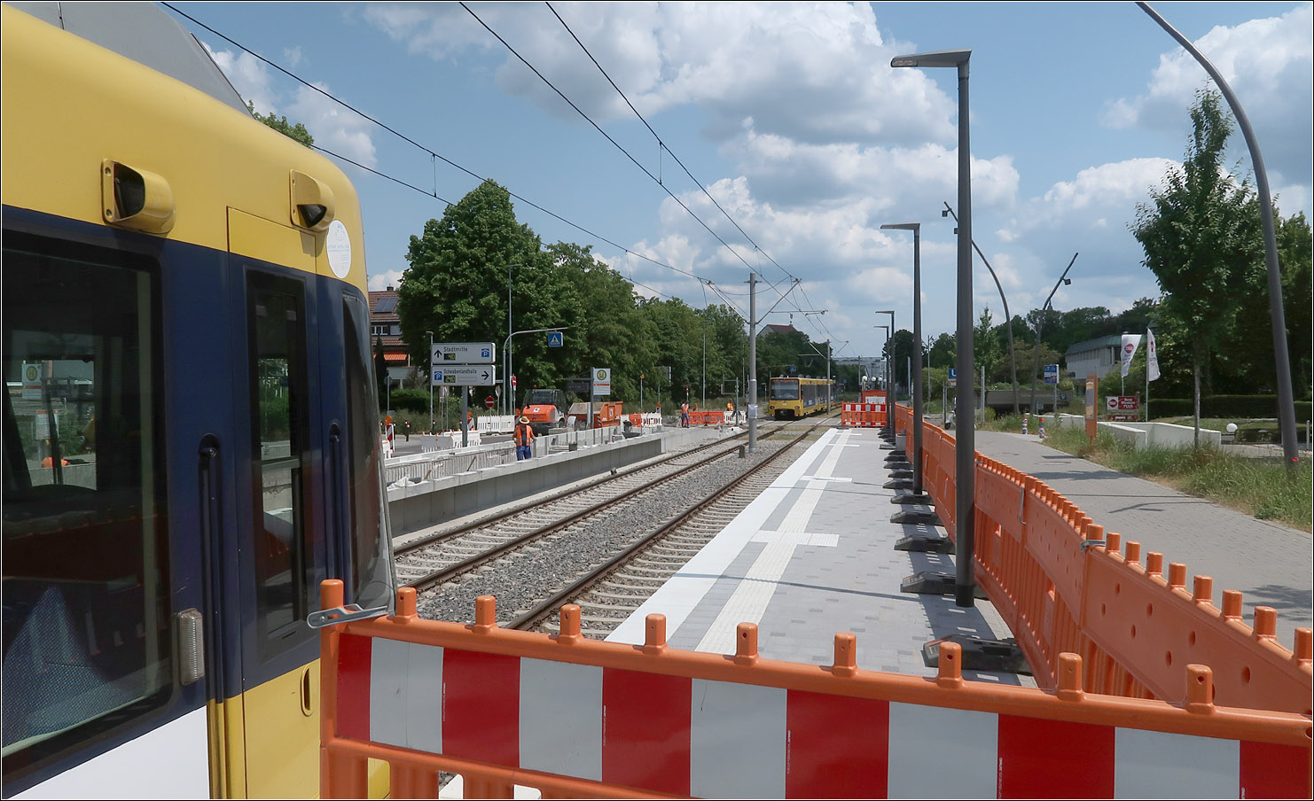 Im Bild die dann temporäre Endhaltestelle Schwabenlandhalle, bei der die Bauarbeiten schon weit fortgeschritten sind.