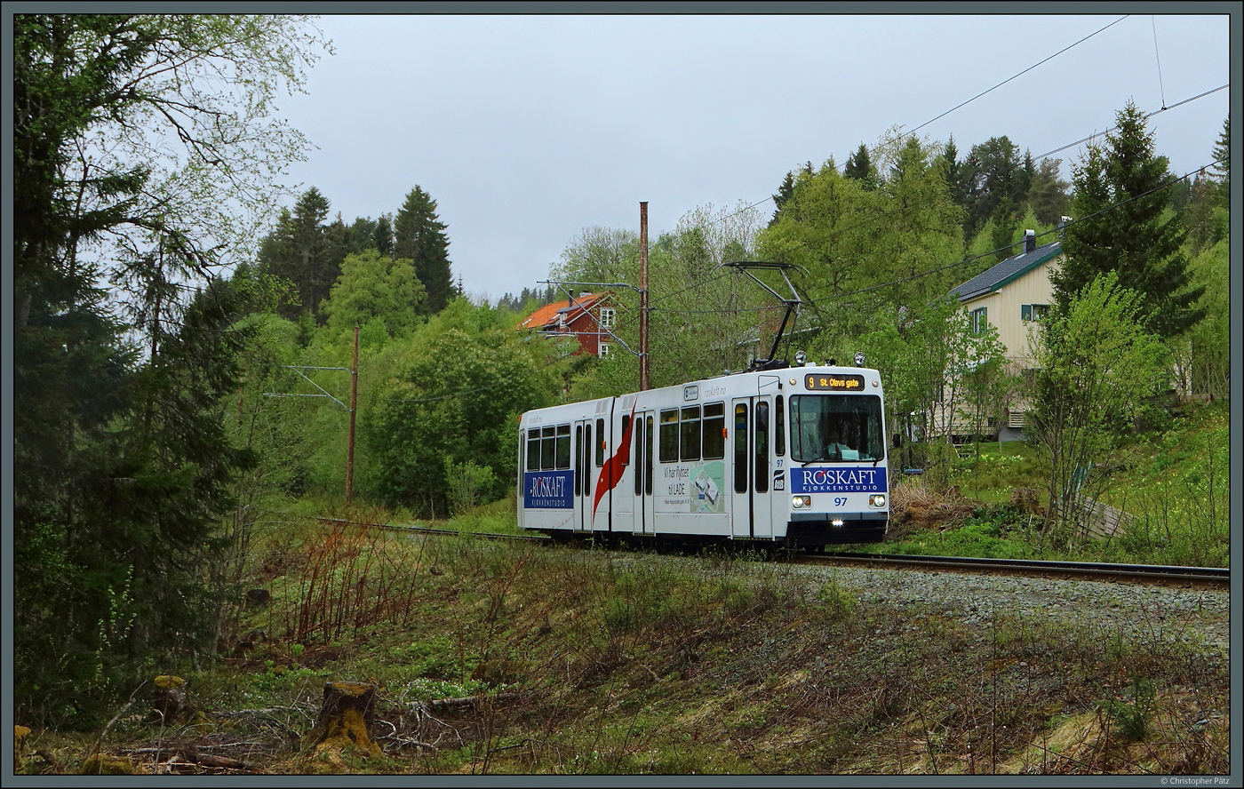 Unweit der Endstelle Liam rollt Triebwagen 97 der Trondheimer Straßenbahn am 25.05.2023 hinab Richtung Stadtzentrum.