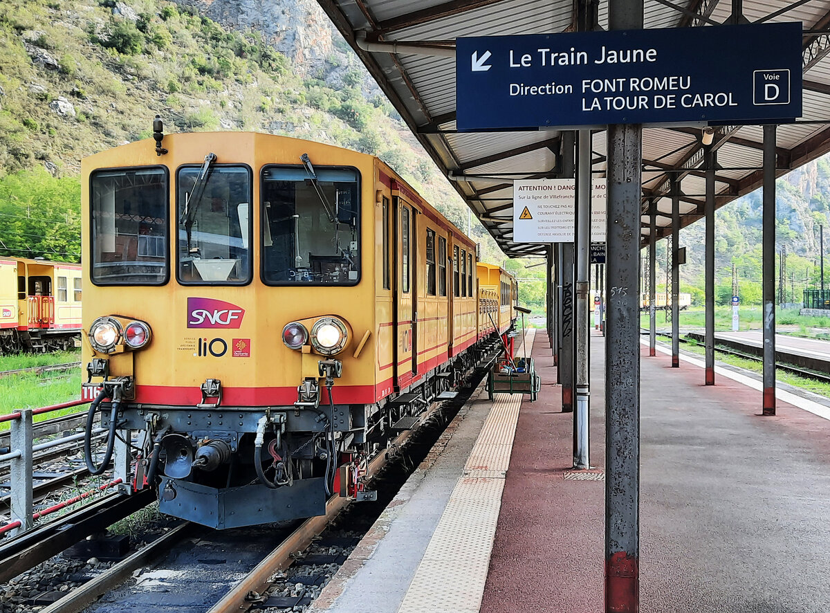 Ein Bild mit Seltenheitswert: im Bahnhof Latour-de-Carol kommen drei verschiedene Spurbreiten zusammen: links die Schmalspur 1000mm mit dem Train Jaune, in der Mitte die Normalspur 1435mm mit dem wartenden Nachtzug nach Paris und rechts die Iberische Breitspur 1668mm mit dem Zug von/nach Barcelona. Der Standort des Fotografen ist auf dem Gleisübergang für die Passagiere zu den hinteren Bahnhofgleisen (rechts). Latour-de-Carol, 24.5.2023