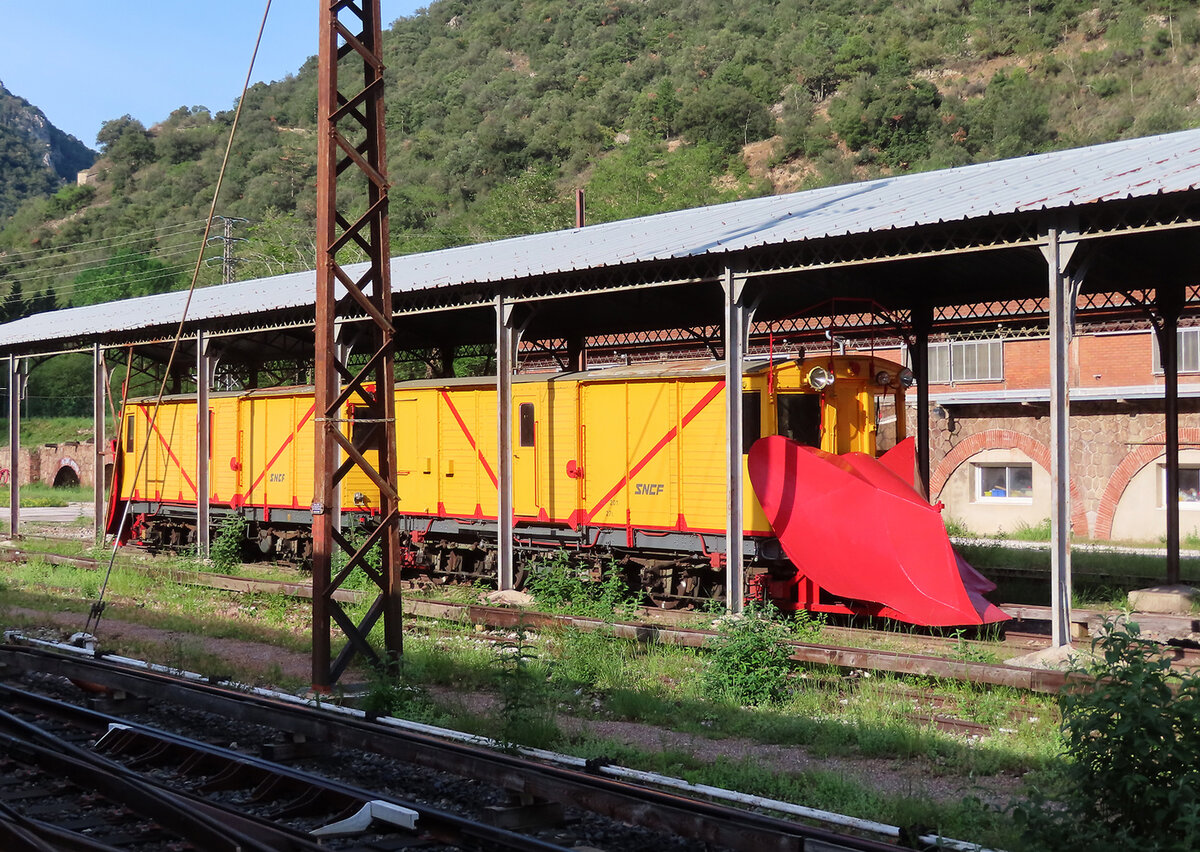 Der Train Jaune wird mit 850 Volt Gleichstrom betrieben, die Stromaufnahme folgt über eine seitliche Stromschiene. Im Bahnhof Mont-Louis-La Cabanasse sieht das in diesem Weichenbereich so aus. Mont-Louis-La Cabanasse, 24.5.2023