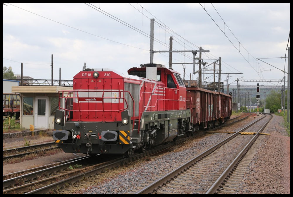 CFL Cargo 310, eine DE 18 von Vossloh, hat am 24.5.2023 um 17.10 Uhr einen Schrottzug in den Werkbahnhof in Belval Universite geschoben und kehrt nun von dort zurück.