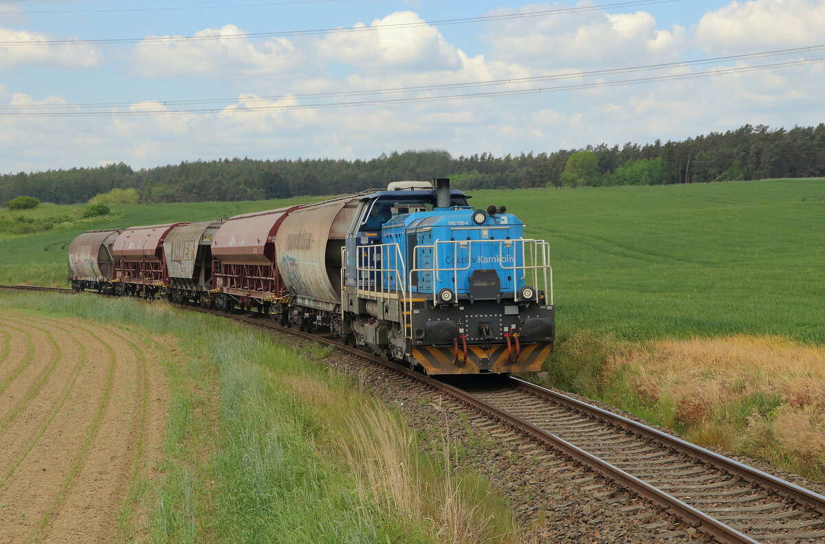 Die 742 735 mit leerem Getreidezug als Mn 87712 von Bor unterwegs nach Plzen. Der Zug wurde am 30.05.2023 auf der Strecke zwischen Bor u Tachova und Svojsin in der Nähe des Dorfes Holostrevy bildlich dokumentiert werden. Leider versteckte sich hier die Sonne wieder hinter den Wolken.