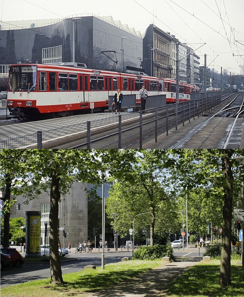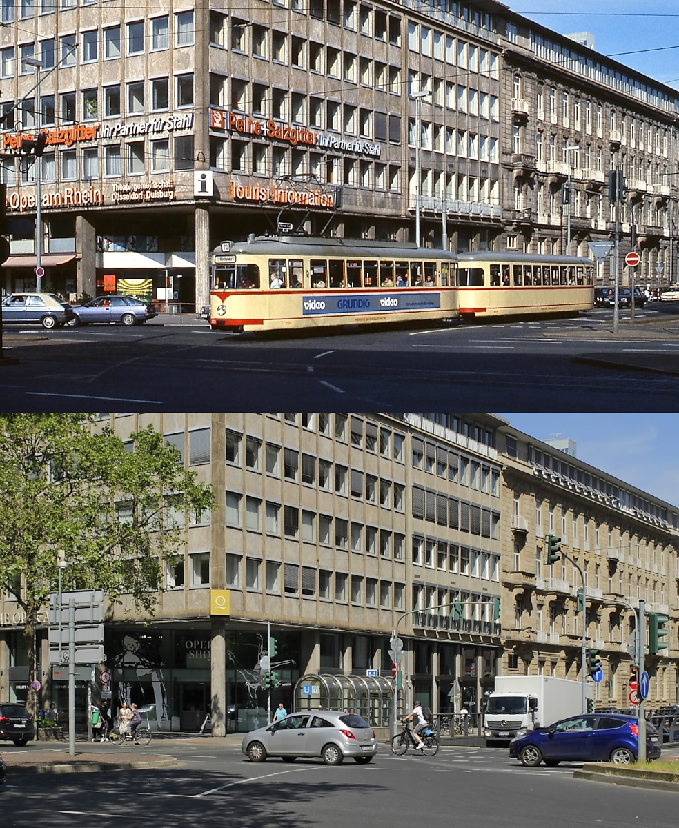 Auch wenn ich mich nicht auf den Meter genau festlegen will, aber diese beiden Aufnahmen entstanden zumindest fast von derselben Stelle: Oben fährt der GT6 2507 um 1990 aus der Schadowstraße in Richtung Jan-Wellem-Platz, darunter eine aktuelle Aufnahme vom 31.05.2023. Heute verkehrt die Bahn im Tunnel und auf der früheren Tuchtinsel steht der Kö-Bogen 2, entworfen vom renommierten Düsseldorfer Architektenbüro Ingenhoven (wenns bei dem einen oder anderen jetzt klingelt: richtig, von diesem Büro stammen auch die Pläne für den neuen Stuttgarter Hauptbahnhof). Bei dem mit acht Kilometer Buchenhecken begrünten Gebäudeblock soll es sich übrigens um Europas größte Grünfassade handeln. Anhaltspunkte für den Fotostandort waren die Gleise (jetzt Rasengleis) im Vordergrund und das ganz rechts auf dem oberen Bild sichtbare Gebäude.