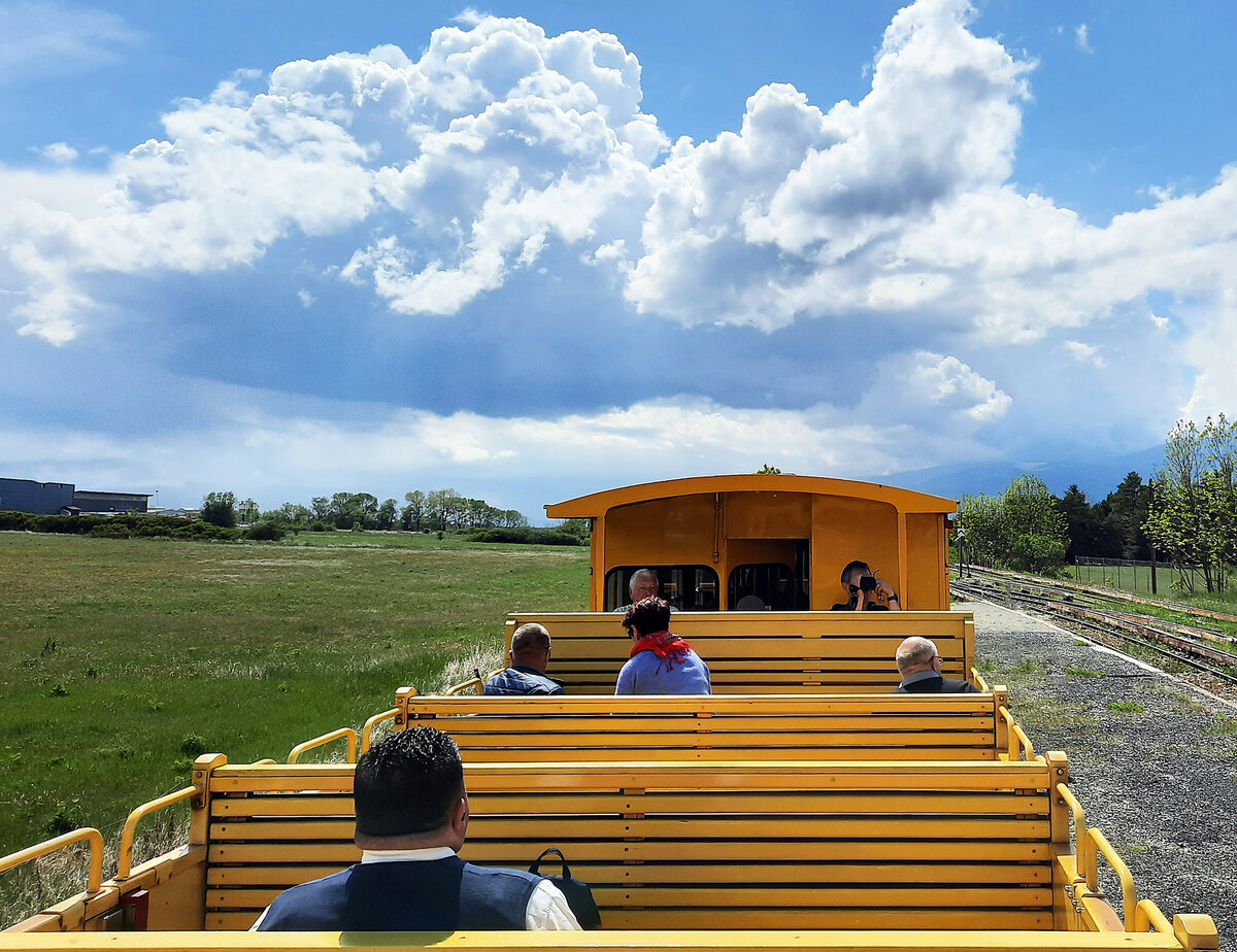 Gemütliche Fahrt an der frischen Bergluft vor den schneebedeckten Bergen. Gut ersichtlich ist hier die seitliche Stromschiene links vom Gleis. Latour-de-Carol, 24.5.2023