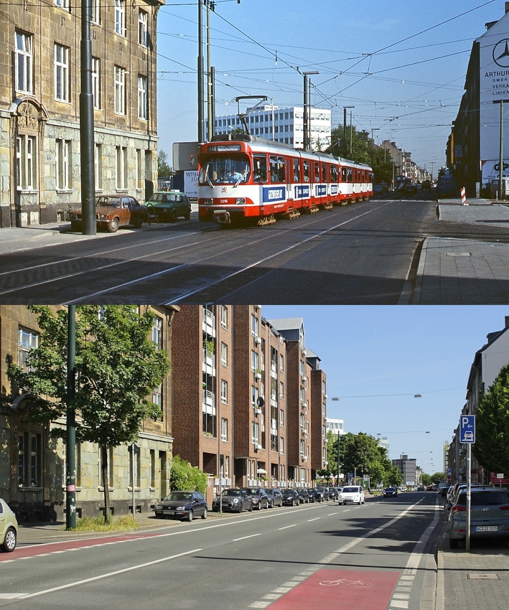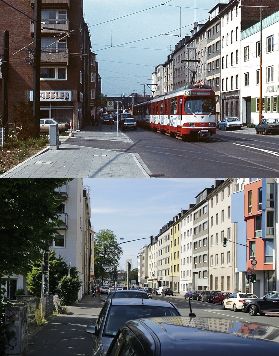 Die Kölner Straße in Düsseldorf zwischen Oberbilker Markt und Worringer Platz im Juni 1988 und am 31.05.2023: Auf der oberen Aufnahme fahren der GT8SU 3216 und ein weiterer GT8SU in Richtung Hauptbahnhof, heute erinnert nichts mehr an die Straßenbahn, dafür steht den Radfahrern eine eigene Spur zur Verfügung.