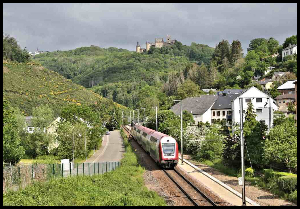 Ein von der CFL Lokomotive 4004 geschobener Regionalexpress nähert sich aus Kautenbach kommend am 23.5.2023 um 9.40 Uhr dem Haltepunkt Michelau. Im Hintergrund ragt die Burg Bourscheid empor.